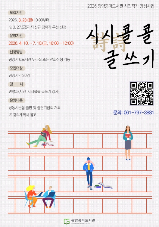 [파이낸셜경제=김예빈 기자] 광양중마도서관은 시민의 창작 역량을 높이고 문학 활동 참여 기회를 넓히기 위해 1인 1책 '시민작가 양성사업'의 하나로 ‘시시(詩詩)콜콜 글쓰기’ 프로그램을 운영한다.