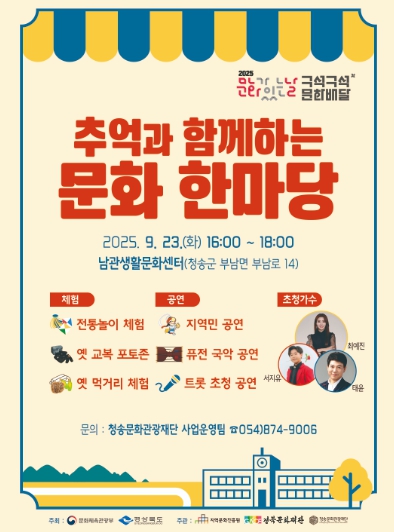 [파이낸셜경제=김지훈 기자] (재)청송문화관광재단은 오는 9월 23일 오후 4시부터 6시까지 부남면에 위치한 남관생활문화센터에서 2025 문화가 있는 날 ‘구석구석 문화배달’ 프로그램의 일환인 ‘추억과 함께하는 문화한마당’을 개최한다.