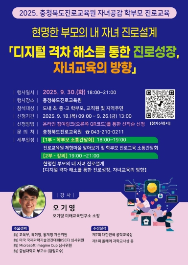 [파이낸셜경제=김기보 기자] 충청북도교육청 직속기관 진로교육원은 오는 30일 18시에 학부모들이 변화하는 미래사회에 맞춰 자녀의 진로설계 역량을 강화할 수 있도록 2025 하반기 학부모 진로교육을 운영한다고 밝혔다.