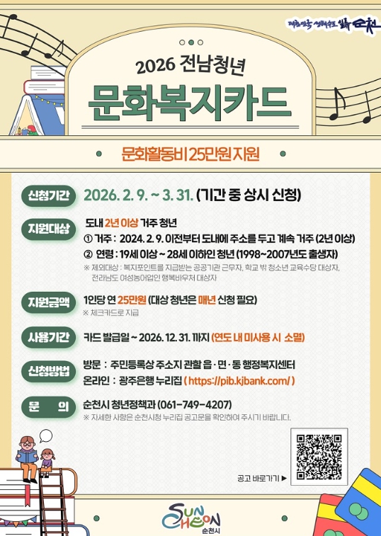 [파이낸셜경제=김예빈 기자] 순천시는 청년들의 문화생활 향유 및 자기계발 활동을 지원하기 위해 2026년 전남청년 문화복지카드 지원사업 대상자를 오는 3월 31일까지 모집한다.