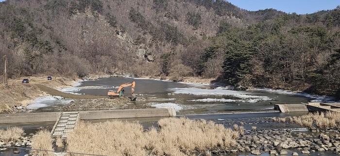 | ▲ 진안군, 겨울 가뭄 속 생활용수 위기 선제 대응으로 극복(섬진강 준설공사사진) |