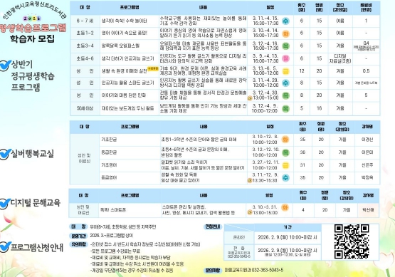 [파이낸셜경제=김기보 기자] 인천광역시교육청신트리도서관은 지역 주민의 생애주기별 학습 기회 제공을 위해 2026년 상반기 평생학습프로그램 학습자를 모집한다.