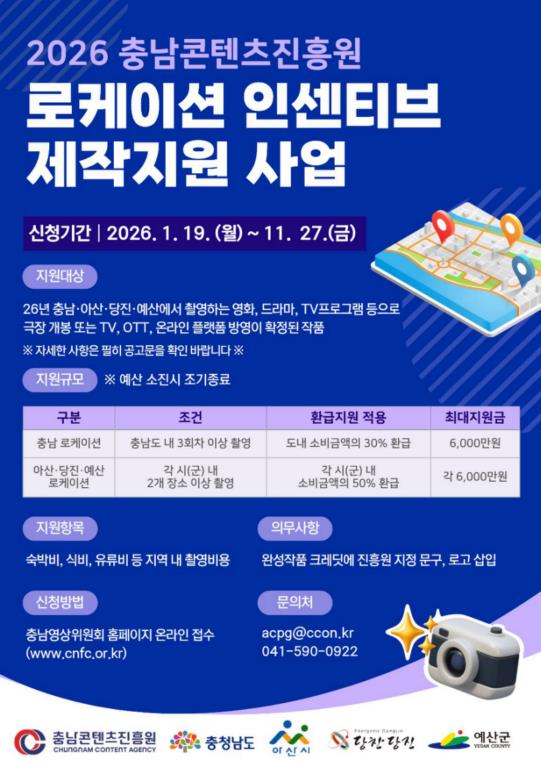 충남 로케이션 인센티브는 도내에서 3회차 이상 촬영한 작품을 대상으로 도내 소비 금액의 30%(최대 6천만 원)를 환급하며, 당진·아산·예산 로케이션 인센티브는 각 지역 내 2개 이상의 장소에서 촬영한 작품을 대상으로 지역 소비 금액의 50%(최대 6천만 원)를 지원한다.