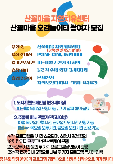 [파이낸셜경제=김영란 기자] 금산군보건소는 어린이를 대상으로 한 체험 프로그램 산꽃마을 오감놀이터를 10월부터 11월까지 산꽃마을 자연치유센터(군북면 산꽃로 672)에서 운영한다.