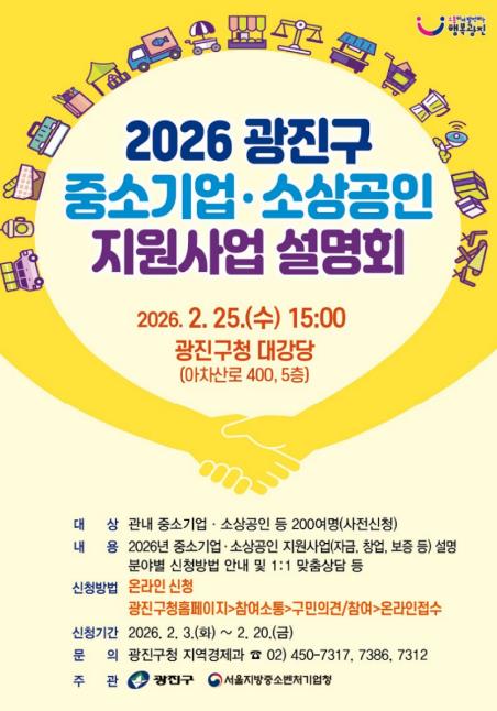 [파이낸셜경제=김예빈 기자] 광진구가 2월 25일 광진구청 대강당에서 서울지방중소벤처기업청과 함께 ‘2026 광진구 중소기업‧소상공인 지원사업 설명회’를 개최한다.