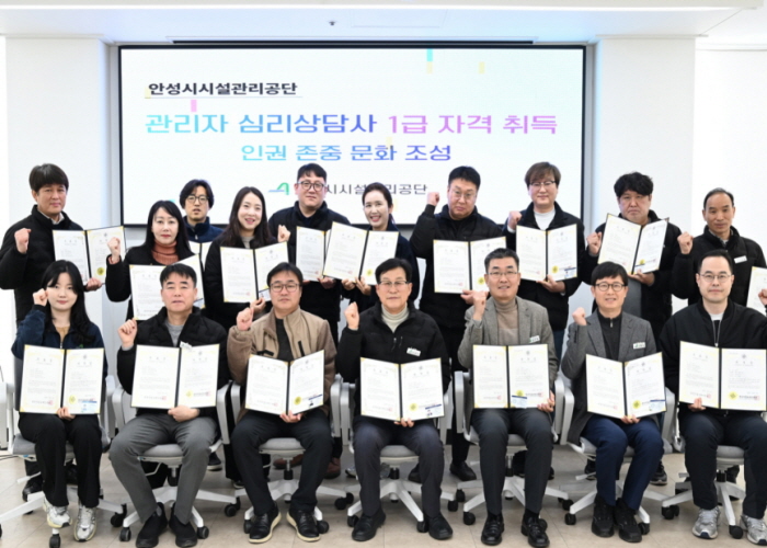 [파이낸셜경제=김기보 기자] 안성시시설관리공단은 조직 내 인권존중 문화 정착과 관리자 상담 역량 강화를 위해 관리자 대상 심리상담사 자격 취득 교육을 실시하고 전원이 자격을 취득했다고 밝혔다.