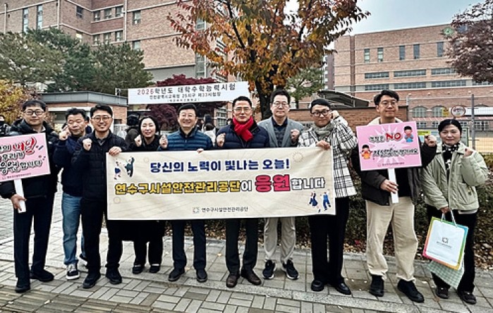 [파이낸셜경제=김기보 기자] 연수구시설안전관리공단(이사장 직무대행 장해윤)은 13일 오전 7시, 2026학년도 대학수학능력시험이 치러진 송도 박문여자고등학교 앞에서 임직원 11명이 참여한 수험생 응원 캠페인을 전개했다고 밝혔다.