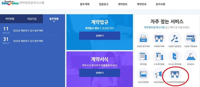 | ▲ 해운대구 홈페이지 내 ‘수의계약 희망업체등록’ 코너 신설 |