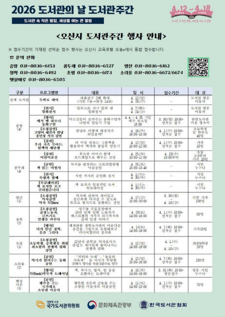 이번 도서관주간은 ‘도서관 속 작은 펼침, 세상을 여는 큰 열림’을 주제로 시민들의 일상 속 독서문화 확산과 도서관 이용 활성화를 위해 기획됐다. 오산시 중앙·꿈두레·양산·청학·초평·소리울·햇살마루 등 공공도서관 전반에서 총 16개 프로그램이 진행될 예정이다.