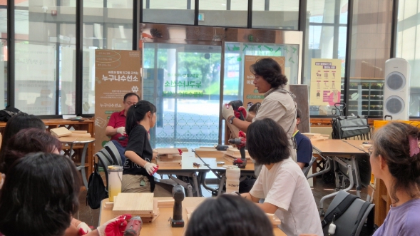 | ▲ ‘누구나수선소’에서 주민들이 생활용품 수선을 위한 기초 목공 실습을 진행 중이다. |