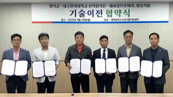 [파이낸셜경제=김영란 기자] 영덕군과 로하스수산식품지원센터를 위탁 운영하는 대구한의대학교 산학협력단, 그리고 관내 농산물법인 해파랑브루어리와 수산물업체 정승식품이 지난 29일 산·학·연·관 간 기술이전 협약을 체결했다.
