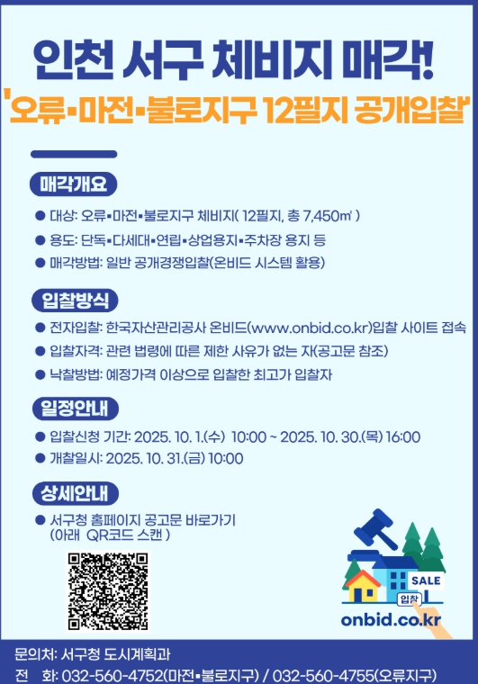 [파이낸셜경제=김기보 기자] 인천 서구는 오는 10월 1일부터 30일까지 오류, 마전, 불로지구 토지구획정리사업구역 내 체비지 12필지를 일반 공개경쟁 입찰(전자입찰) 방식으로 매각한다고 밝혔다.