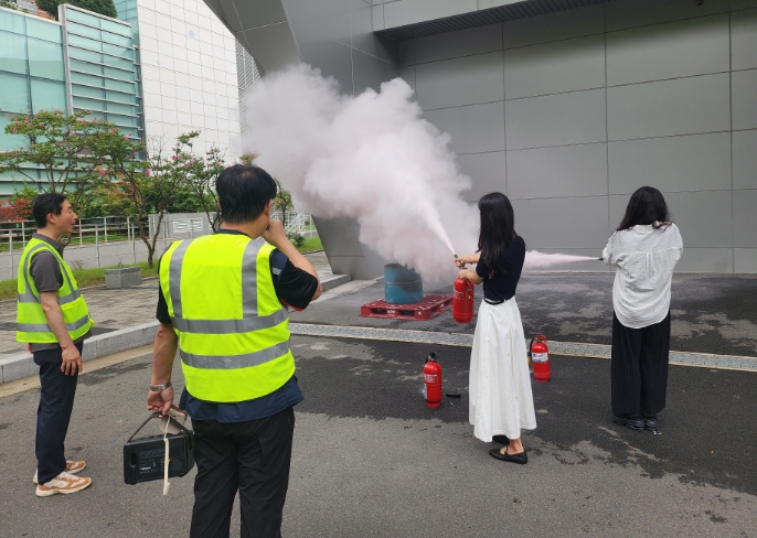 3층 전시장 하역장에 화재 상황을 가정하여 화재 발생 사실 전파, 초기 진압, 인명 대피, 응급 처치까지 이어지는 전 과정에 현장 대응력을 높였으며, 소화기·소화전·심폐소생술 실습도 병행했다.