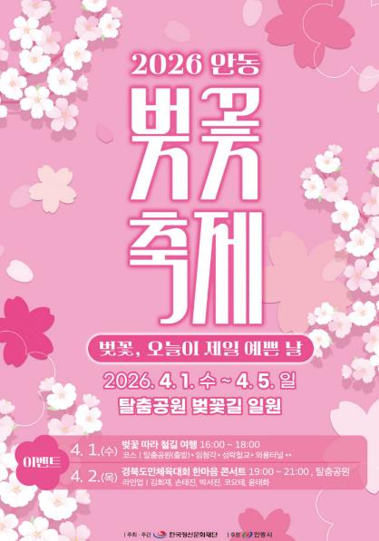 [파이낸셜경제=김지훈 기자] 안동시와 한국정신문화재단은 오는 4월 1일부터 5일까지 낙동강변 벚꽃길 일원에서 ‘2026 안동 벚꽃축제’를 개최한다고 밝혔다.
