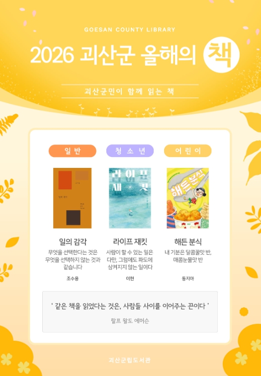 [파이낸셜경제=김기보 기자] 충북 괴산군립도서관이 2026년 괴산군 올해의 책으로 일반, 청소년, 아동 분야 각 1권씩 총 3권을 최종 선정했다고 20일 밝혔다.