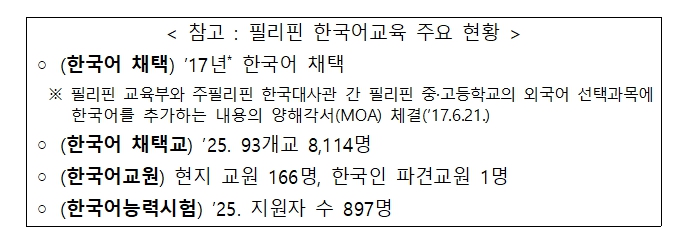 필리핀은 2017년에 현지 정규 교육과정의 외국어 과목으로 한국어를 정식 채택하는 것으로 결정하고, 2018년부터 한국어반을 운영해 왔다. 현재는 90여 개 학교에서 8,000여 명의 학생들이 한국어를 배우고 있다. 이번 양해각서는 한국 교육부가 필리핀 내 한국어 교사들을 위한 집중 연수 과정을 지원하여, 한국어교육 전문성을 높이도록 하는 내용이 핵심이다.
