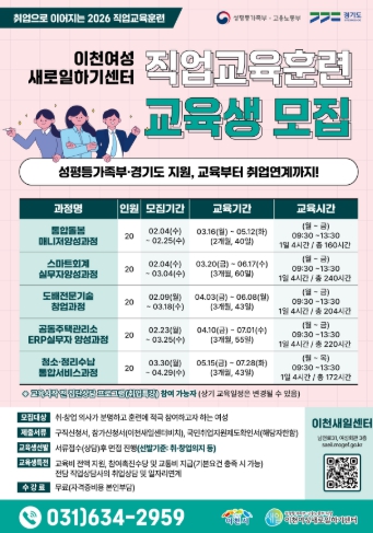 [파이낸셜경제=김기보 기자] 이천여성새로일하기센터는 경력 단절 여성의 직업능력 개발과 취·창업 연계를 위해 2026년 직업교육훈련 교육생을 모집한다.