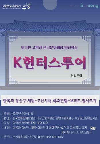 [파이낸셜경제=김지훈 기자] 대구 수성문화재단은 올해 2월부터 11월까지 대구·경북 외국인 유학생을 대상으로 한국문화체험 현장학습 ‘K헌터스 투어’를 운영한다.