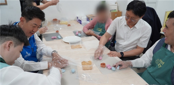 | ▲ 박지훈 신한은행 인천금융센터 지점장과 최진산 부지점장이 지난 1일 미추홀푸르내에서 거주 장애인들과 송편을 빚고 있다. |