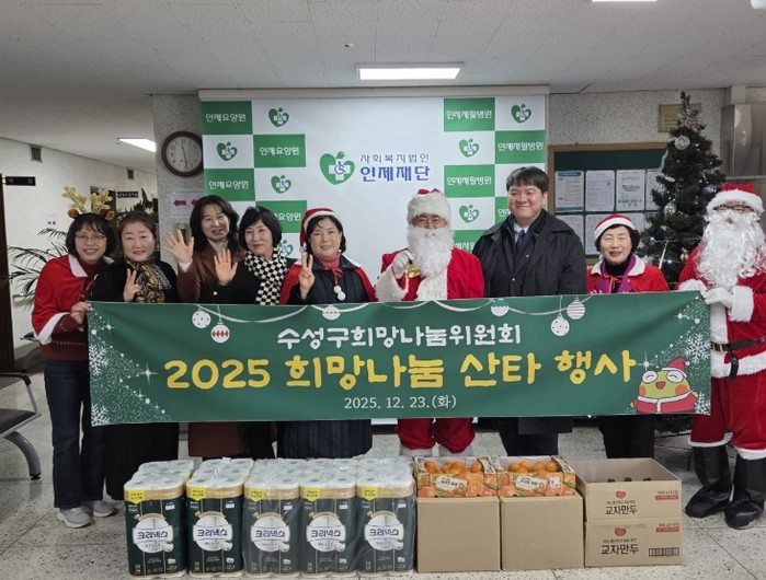 [파이낸셜경제=김지훈 기자] 대구 수성구희망나눔위원회(회장 배영호)는 크리스마스를 앞둔 지난 23일 관내 이웃들에게 사랑과 희망을 전하는 ‘2025 희망 나눔 산타 행사’를 개최해 지역사회의 훈훈한 연말 분위기 조성에 앞장섰다.