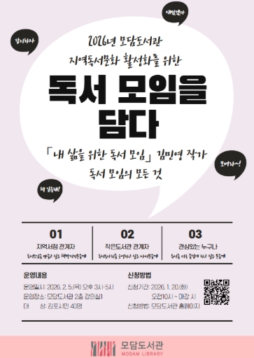 [파이낸셜경제=김기보 기자] 김포시 모담도서관은 독서 모임을 주제로 2월 5일 목요일 오후 3시부터 5시까지 저자 강연을 운영한다.