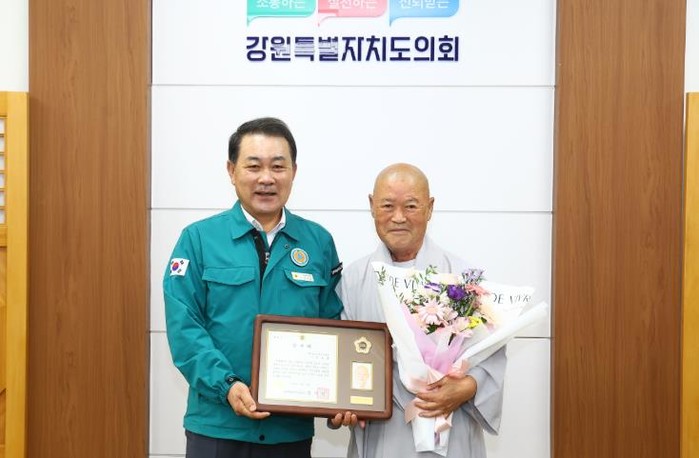 [파이낸셜경제=조성환 기자] 강원특별자치도의회는9월 18일, 강원특별자치도의회에서 지역사회 봉사와 종교․문화 발전에 기여한 공로로 원주지역의 현각스님(원주 성불원 주지)에게 감사패를 전달했다.