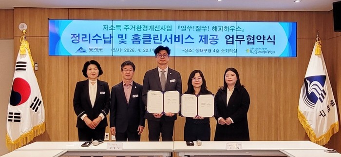 [파이낸셜경제=김영란 기자] 부산 동래구는 지난 22일 부산동래지역자활센터(센터장 김희영)와 ‘얼쑤절쑤 해피하우스’ 저소득 주거환경개선사업의 일환으로 정리 수납 및 홈클린 서비스 제공 업무 협약을 체결했다고 밝혔다.
