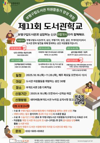 [파이낸셜경제=김기보 기자] 부평구 구립 부개도서관은 18일부터 2025년 부평구립도서관 자원활동가 양성 과정 ‘제11회 도서관학교’ 참가자를 모집한다.