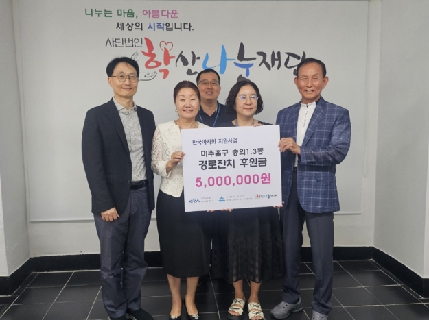 [파이낸셜경제=김기보 기자] 미추홀구 숭의1·3동 지역사회보장협의체(위원장 민명숙)는 한국마사회 인천미추홀지사(지사장 조영진)의 공모사업에 ‘숭의1·3동 경로잔치’가 선정돼 지난 18일 기부금 500만 원을 전달받았다.