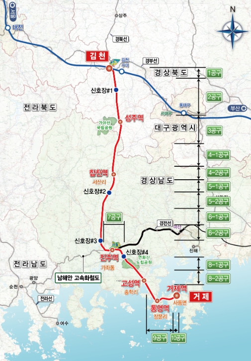남부내륙철도는 현재 전체 14개 공구 중 10개 공구에 대해 시공 계약을 완료했다. 10공구는 기본설계 기술제안 방식으로 추진 중이며, 나머지 3개 공구(1·7·9공구)는 상반기 중 실시설계 기술제안 방식으로 공고될 예정이다.