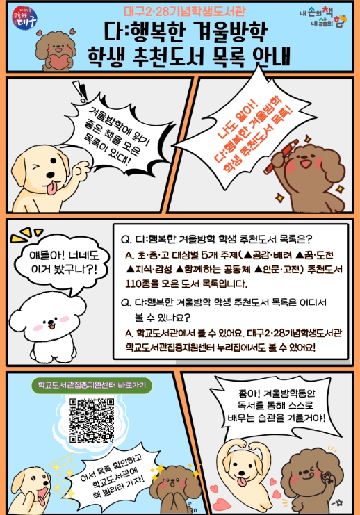 [파이낸셜경제=김지훈 기자] 대구2·28기념학생도서관은 겨울방학을 맞아 학생들이 독서를 통해 정서적 성장과 사고력 신장을 도모할 수 있도록 학생 맞춤형 추천도서 목록인 ‘다:행복한 겨울방학 학생 추천도서 목록’을 배포한다.