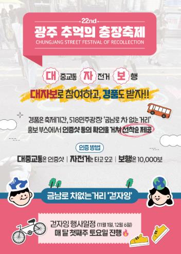 이곳에서는 금남로 차 없는 거리 사업의 필요성과 그동안 추진 성과를 효과적으로 홍보하기 위해 ▲포토존 이벤트(포토존에서 찍은 사진을 SNS에 올리면 경품을 선착순으로 제공) ▲대자보 실천 이벤트(대중교통, 자전거, 보행을 이용해 참여한 방문객에게 선착순으로 경품 증정) 등을 진행한다.