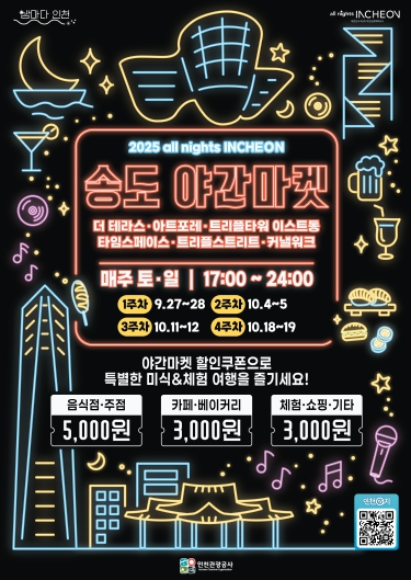 [파이낸셜경제=김기보 기자] 인천광역시와 인천관광공사(사장 백현)는 9월 27일부터 10월 19일까지 매주 토·일 4주간 송도 일대 6개 상권에서 풍성한 할인혜택과 더불어 상권별 다양한 행사를 즐길 수 있는‘2025 all nights INCHEON 송도 야간마켓’을 개최한다고 밝혔다.