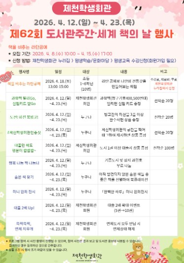 제천학생회관장은 “도서관주간을 맞아 누구나 부담 없이 도서관을 찾고, 책을 통해 새로운 즐거움과 경험을 얻는 시간이 되길 기대한다”며 “앞으로도 지역과 함께하는 열린 문화공간으로서 역할을 이어가겠다”고 밝혔다.
