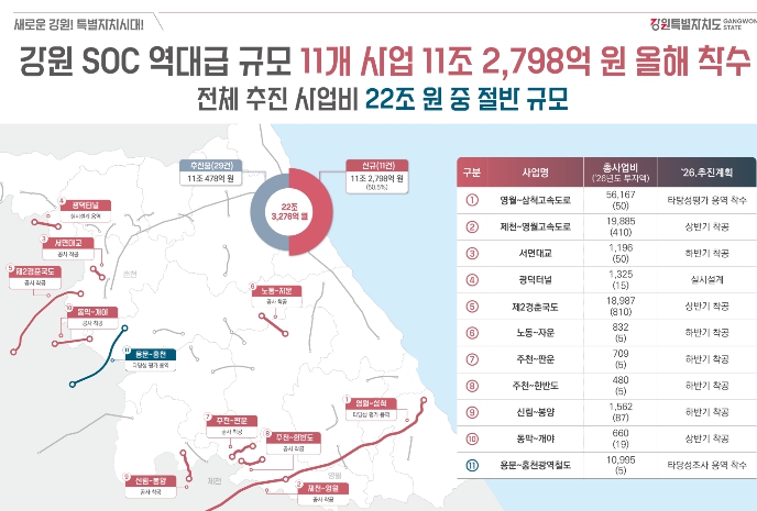 [파이낸셜경제=조성환 기자] 강원특별자치도는 현재 추진 중인 SOC 교통망 사업 22조 원 가운데 절반이 넘는 11조 원 규모의 사업을 올해 본격 착수한다고 밝혔다.