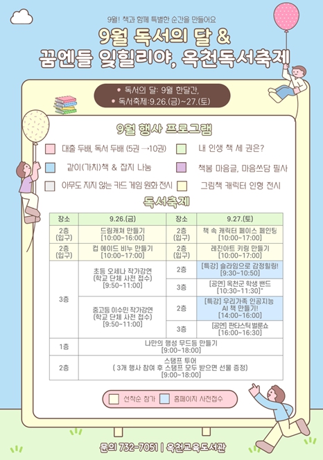 9월 27일에는 옥천지역 중·고등학생으로 이루어진 학생 밴드 공연이 축제의 열기를 더하고, 온 가족이 함께 즐길 수 있는 '판타스틱 벌룬쇼'가 펼쳐질 예정이다. 또한 '일곱 빛깔 감정 나라' 도서를 읽고 슬라임을 만들며 감정을 치유하는 '슬라임으로 감정 힐링!' 특강과 생성형 AI를 활용해 가족만의 이야기를 담은 책을 만드는 '우리 가족 인공지능 AI 책 만들기' 특강도 마련되어 있다.