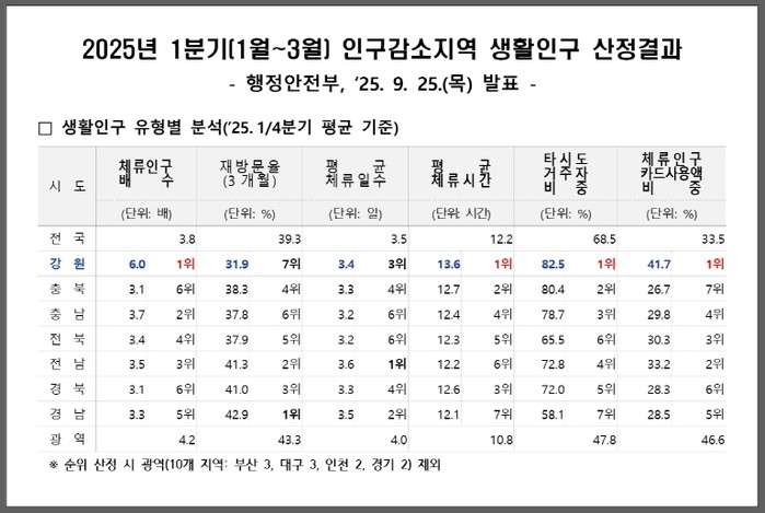 [파이낸셜경제=조성환 기자] 강원특별자치도는 행정안전부가 9월 25일 발표한 ‘2025년 1분기 인구감소지역 생활인구 산정 결과’에서 체류인구 총 2,826,012명으로 전국 최고 수준을 기록했다고 밝혔다.