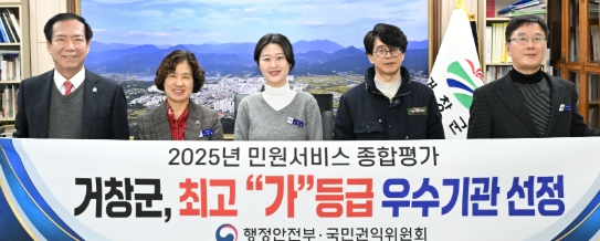 [파이낸셜경제=김예빈 기자] 거창군은 국민권익위원회·행정안전부 공동 주관한 ‘2025년 민원 서비스 종합평가’에서 최고 등급인 ‘가등급’에 선정돼 전국 최고 수준의 민원 서비스를 인정받았다.