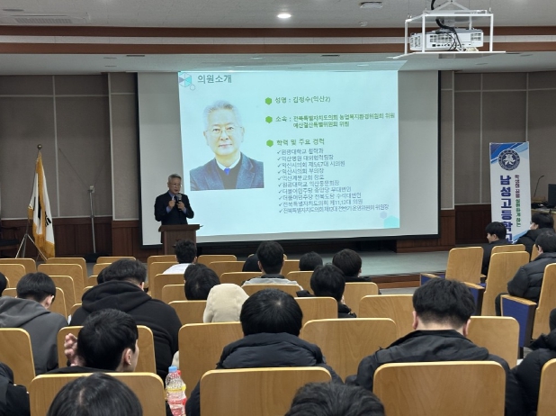 [파이낸셜경제=김예빈 기자] 전북특별자치도의회 김정수 의원(익산2)이 11일 익산 남성고에서 수능을 마친 3학년 학생 270명을 대상으로 ‘도의회와 도의원의 역할, 청소년의 정치 참여’를 주제로 특별 강연에 나섰다.