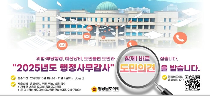 [파이낸셜경제=김예빈 기자] 경상남도의회는 11월 5일부터 18일, 14일간 예정되어 있는 ‘2025년도 행정사무감사’를 앞두고 도민의 의견을 받는다고 밝혔다.