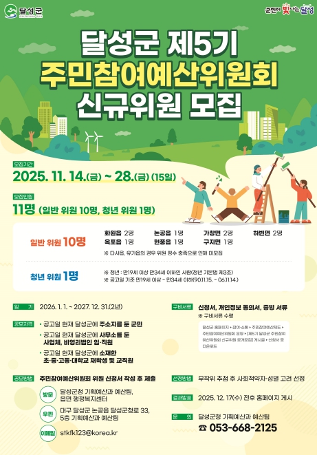 [파이낸셜경제=김지훈 기자] 달성군은 11월 14일부터 28일까지 제5기 주민참여예산위원회 신규위원 11명을 모집한다.