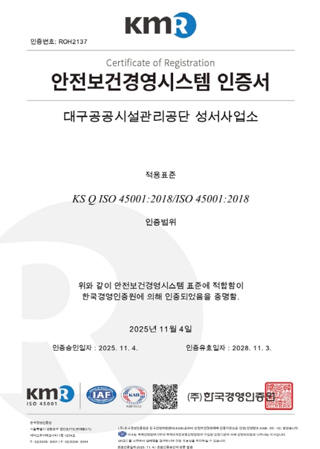 [파이낸셜경제=김지훈 기자] 대구공공시설관리공단 성서사업소는 11월 4일, 한국경영인증원이 실시한 안전보건경영시스템 국제표준(ISO45001) 인증 심사에서 ‘적합’ 판정을 받았다.