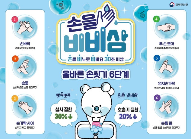 올바른 손 씻기는 감염병 예방을 위한 가장 쉽고 효과적인 방법으로, 흐르는 물에 비누로 30초 이상 손을 씻으면 최근 유행 중인 인플루엔자와 노로바이러스 등 장관감염증과 호흡기 감염병 예방에 큰 효과가 있다.