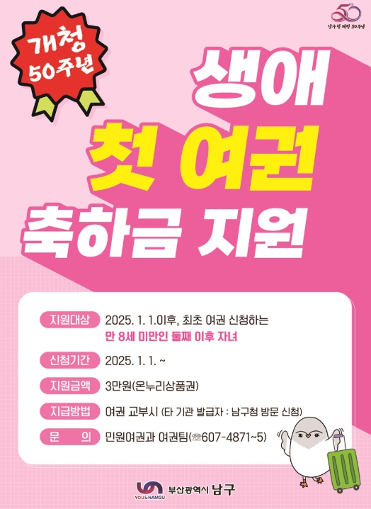 남구에 거주 중인 다자녀가정의 둘째 이후 자녀(8세 미만)가 첫 여권을 발급받을 때 축하금 3만 원(온누리상품권)을 지원하는 사업으로 여권을 받을 때 축하금을 지급해 편리성을 높이고, 남구 외 기관에서 여권을 발급한 경우에도 남구청 방문을 통해 지원받을 수 있도록 했다.
