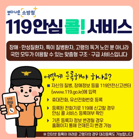 ‘119안심콜’은 장애인, 독거노인, 거동 불편자 등 위기 상황에서 정확한 의사 전달이 어려운 시민들이 자신의 주소, 질병, 연락처 등 정보를 미리 등록해두는 제도다. 신고가 접수되면 등록된 정보가 자동으로 상황실에 뜨기 때문에 골든타임 확보에 큰 도움이 된다.