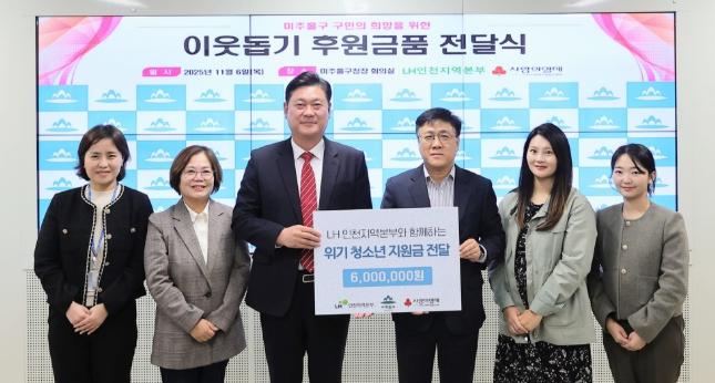 [파이낸셜경제=김영란 기자] 인천 미추홀구는 6일 구청장실에서 한국토지주택공사(LH) 인천지역본부(본부장 서환식)로부터 아동복지시설 지원을 위한 온누리상품권 600만 원을 전달받았다.