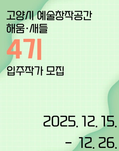 [파이낸셜경제=김기보 기자] 고양특례시는 지역 미술 생태계를 활성화하고 작가들의 안정적인 창작 활동을 지원하기 위해 오는 26일까지‘고양시 예술창작공간 해움·새들’ 제4기 입주작가를 공개 모집한다고 밝혔다.