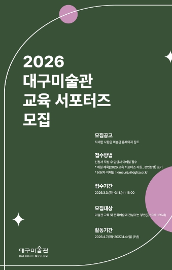 [파이낸셜경제=김지훈 기자] 대구문화예술진흥원 대구미술관은 2026년 한 해 동안 지역 문화예술발전과 미술관 교육 현장을 함께 만들어 갈 문화자원봉사자 ‘교육 서포터즈’를 모집한다.