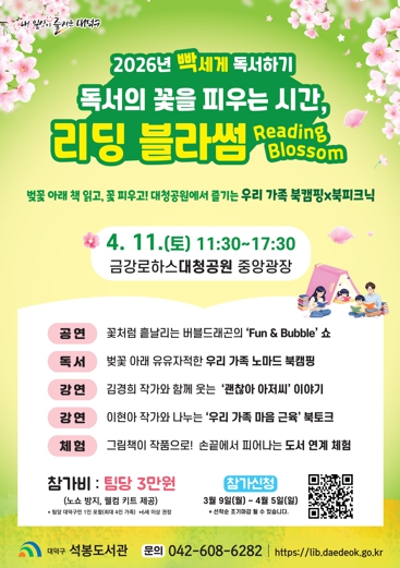 이번 행사는 ‘독서의 꽃을 피우는 시간, 리딩 블라썸(Reading Blossom)’이라는 주제로 대청공원 잔디밭에서 가족이 함께 책을 읽으며 소통하는 북피크닉 형태로 진행된다.