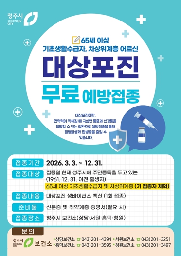 | ▲ 청주시, 취약계층 어르신에 대상포진 예방접종 무료 지원 |